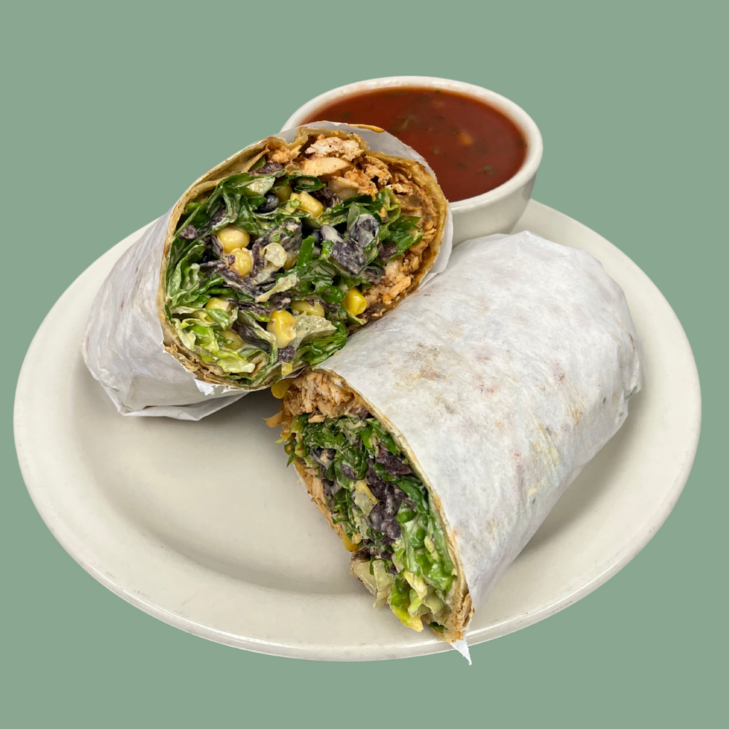 Marinated chicken with chopped lettuce, black beans, blue corn tortilla chips, fresh roasted corn, all wrapped in a garlic herb tortilla. Served with your choice of soup OR house chips.