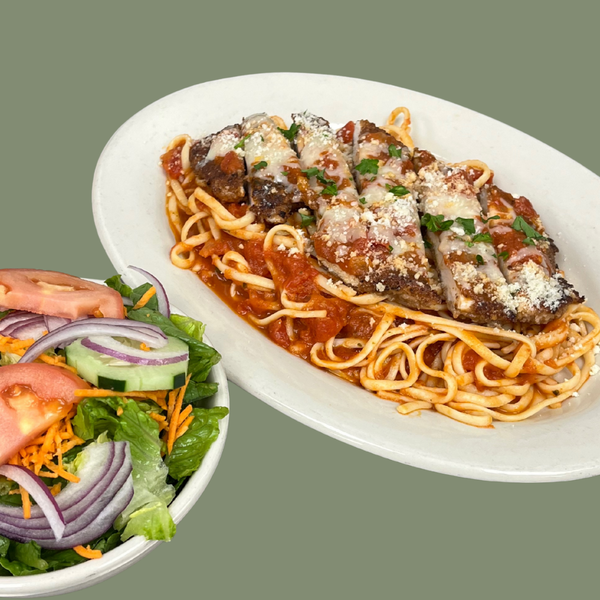 Linguine Pasta topped with crispy, golden-brown chicken topped with savory marinara sauce, melted jack cheese, parmesan and fresh parsley. Served with side salad and dressing of your choice