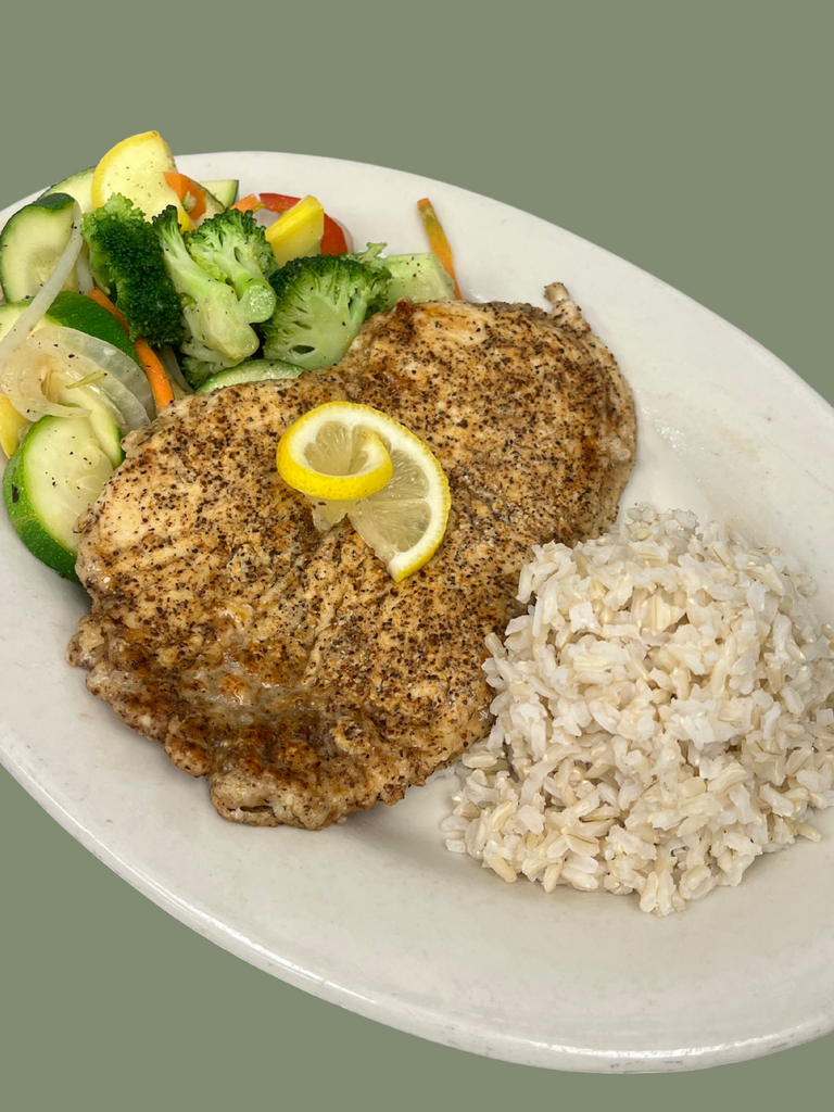 Grilled chicken breast seasoned with lemon pepper, served with a side of brown rice and tender roasted vegetables