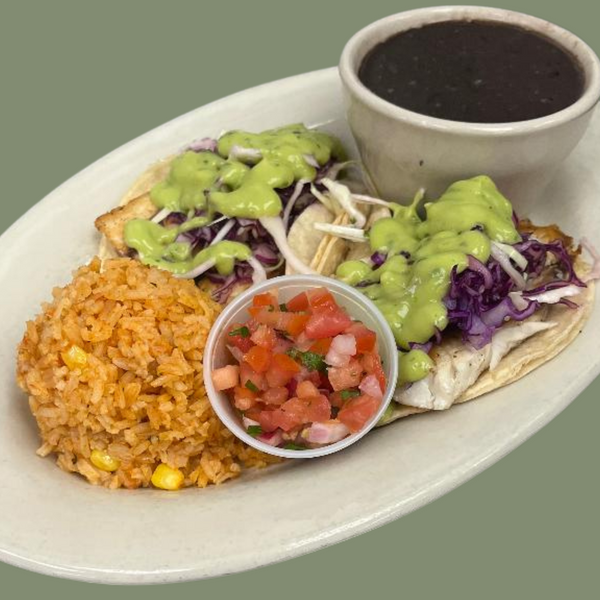 Two Corn Tortillas stuffed with seasoned grilled sea bass, cabbage, pico de gallo, and avocado sauce. Served with Spanish rice and black beans