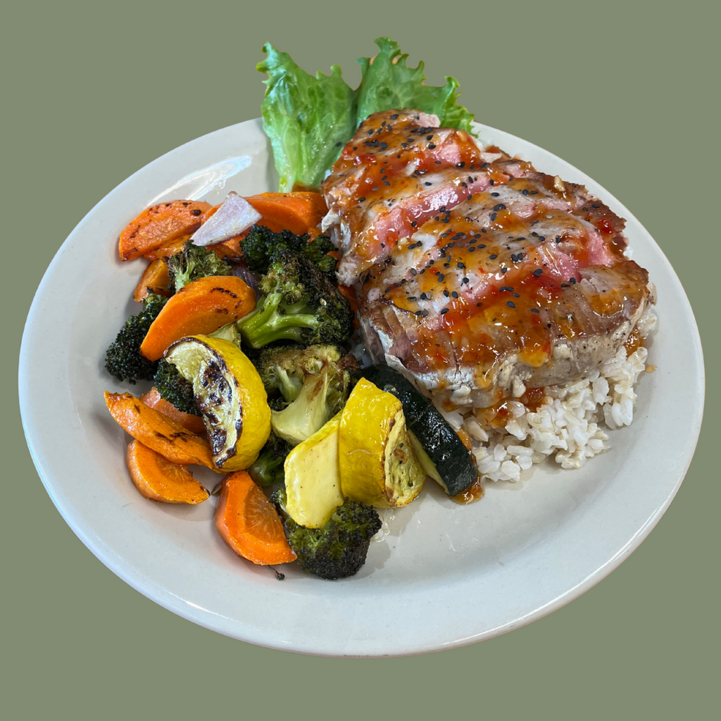 Seared Ahi Tuna brushed with a sweet chili glaze, served over a bed of brown rice with a side of roasted vegetables.